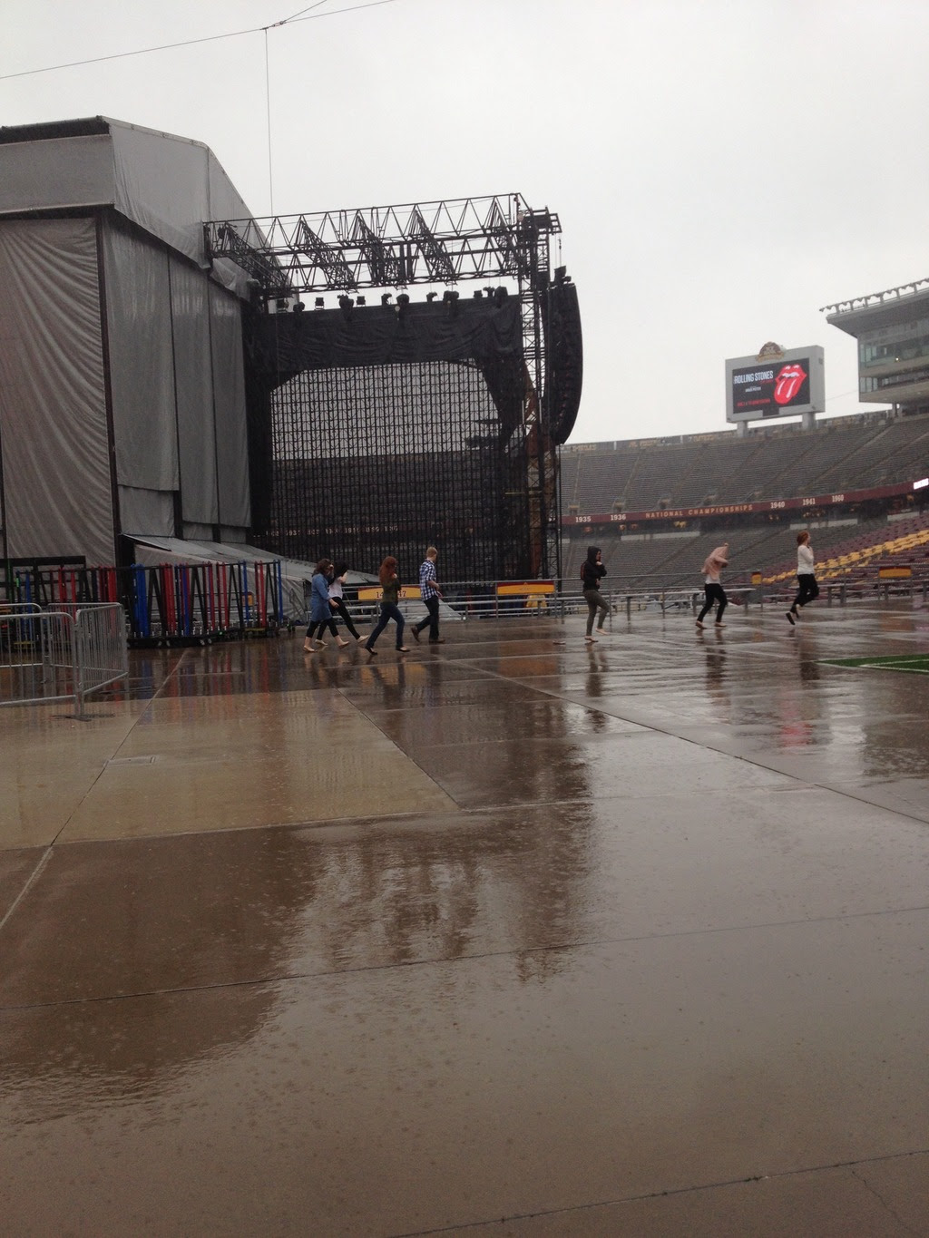 Eu estava a três quadras do estádio quando minha filha ligou para avisar que a passagem de som havia começado. Baixei os vidros e imediatamente reconheci a música: Bitch. Estava longe, mas ainda assim estava alta e clara. Estacionei e corri para o estádio, onde pude ouvir o resto da passagem de som em um lugar aproximadamente a 30 metros atrás do palco, fora do portão, e em seguida voltou a chover. Apenas umas poucas pessoas ficaram durante a passagem de som (que terminou com You Can’t Always Get What You Want) por causa da chuva, então corri para encontrar minha família e amigos que estavam em um Applebee’s (restaurante) a algumas quadras de distância. Ficamos lá até que a chuva desse uma parada, e por isso não vimos o show de abertura, de Grace Potter.