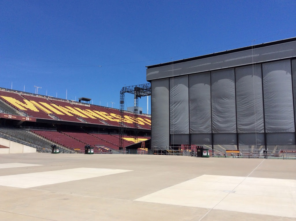 Tudo começou na última segunda-feira, quando visitei o TCF Bank (estádio que sediaria o show) por volta do meio dia, em um belo e ensolarado dia. Caminhei ao redor do estádio para observar o que estava acontecendo. Os caminhões estavam sendo descarregados, muitas pessoas estavam indo e vindo e pude ver a estrutura do palco sendo montada. Mais tarde, fui ao aeroporto para buscar um amigo, que havia viajado de Columbus, onde ele viu o segundo show (ele também estava no show de San Diego, no Petco Park). Depois de buscá-lo no aeroporto, fomos direto ao estádio para que ele pudesse conhecê-lo. Após levá-lo lá, deixei-o no hotel.